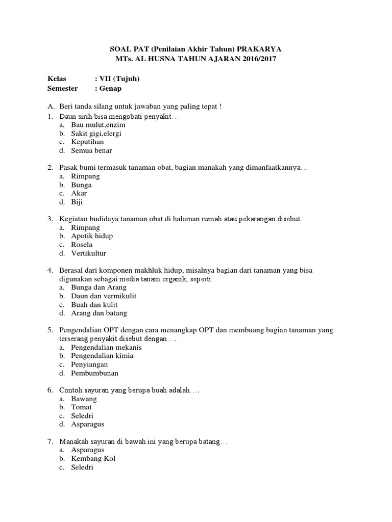 Artikel contoh soal tentang soal prakarya kelas 8 semester 1 kurikulum 2020 pilihan ganda & essay lengkap dengan jawabannya. Berdoalah sebelum kalian mulai menjawab pertanyaan. Lanjut ke soal evaluasi final semester satu => contoh soal uas prakarya kelas x semester 1 k13 beserta jawaban. Contoh tahapan budi daya tanaman obat. Quiz matematika sd kelas 1 smt 2. Bab iv pengolahan bahan pangan sayuran menjadi makanan dan minuman. Soal prakarya kelas 7 semester 2 mankh. Limbah bentuk fungsi a kulit jagung figura tempat foto b kulit jagung boneka alat masak c kulit bawang bunga kotak. Maka dengan itu kakak memilih judul soal pilihan ganda bahasa. Contoh soal pilihan ganda bahasa indonesia kelas 7 kurikulum 2013 semester 2 beserta jawabannya. Soal pts prakarya pengolahan kelas viii. Soal pkn kelas 7 semester 2. Soal ujian tengah semester kelas viii soal pilihan ganda pilihlah jawaban yang paling tepat di antara bab ii gambaran umum perusahaan 2.1.